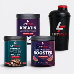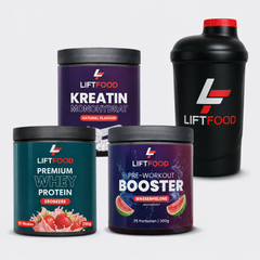 Mit Whey für Regeneration, Booster für maximale Power, Kreatin für mehr Leistung und einem praktischen Shaker, der alles perfekt abrundet.