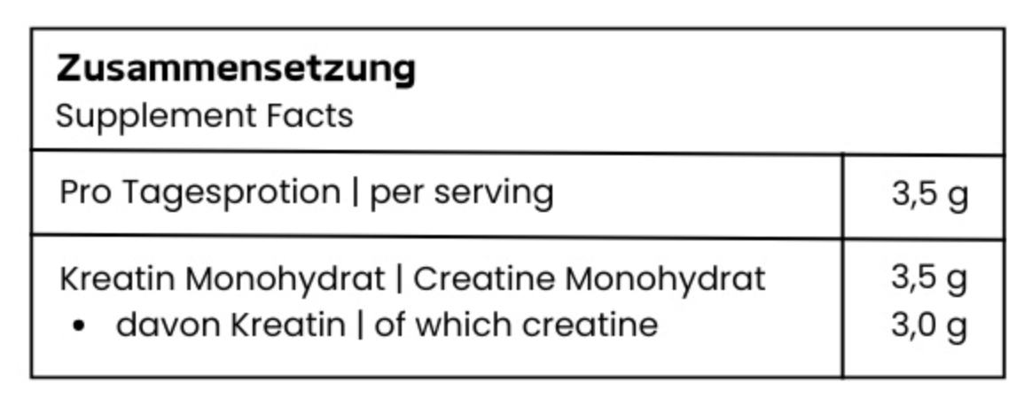 Mische 3,5 g Kreatin (zwei leicht unterfüllte Messlöffel, innenliegend)mit100 ml Wasser oder einem Getränk deiner Wahlund trinke es täglich.