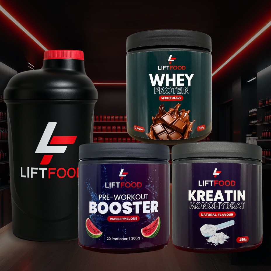 Unser Bundle vereint unsere drei beliebtesten Produkte in einem Paket: Whey für Muskelaufbau, Booster für maximale Energie und Kreatin für mehr Kraft – plus Shaker für perfekte Zubereitung.
