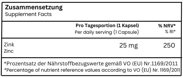Maltodextrin, Zink-Bisglycinat, Trennmittel (Magnesiumsalze der Speisefettsäuren) Kapselhülle (Überzugmittel (Hydroxypropylmethylcellulose))