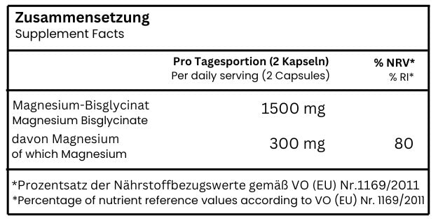 Magnesium-Bisglycinat, Trennmittel (Magnesiumsalze der Speisefettsäuren), Kapselhülle (Überzugsmittel (Hydroxypropylmethylcellulose)