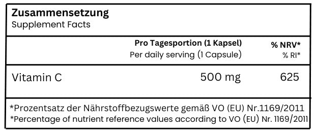 Täglich eine Kapsel (500mg Vitamin C) unzerkaut mit reichlich Flüssigkeit verzehren.